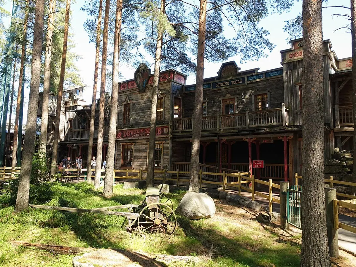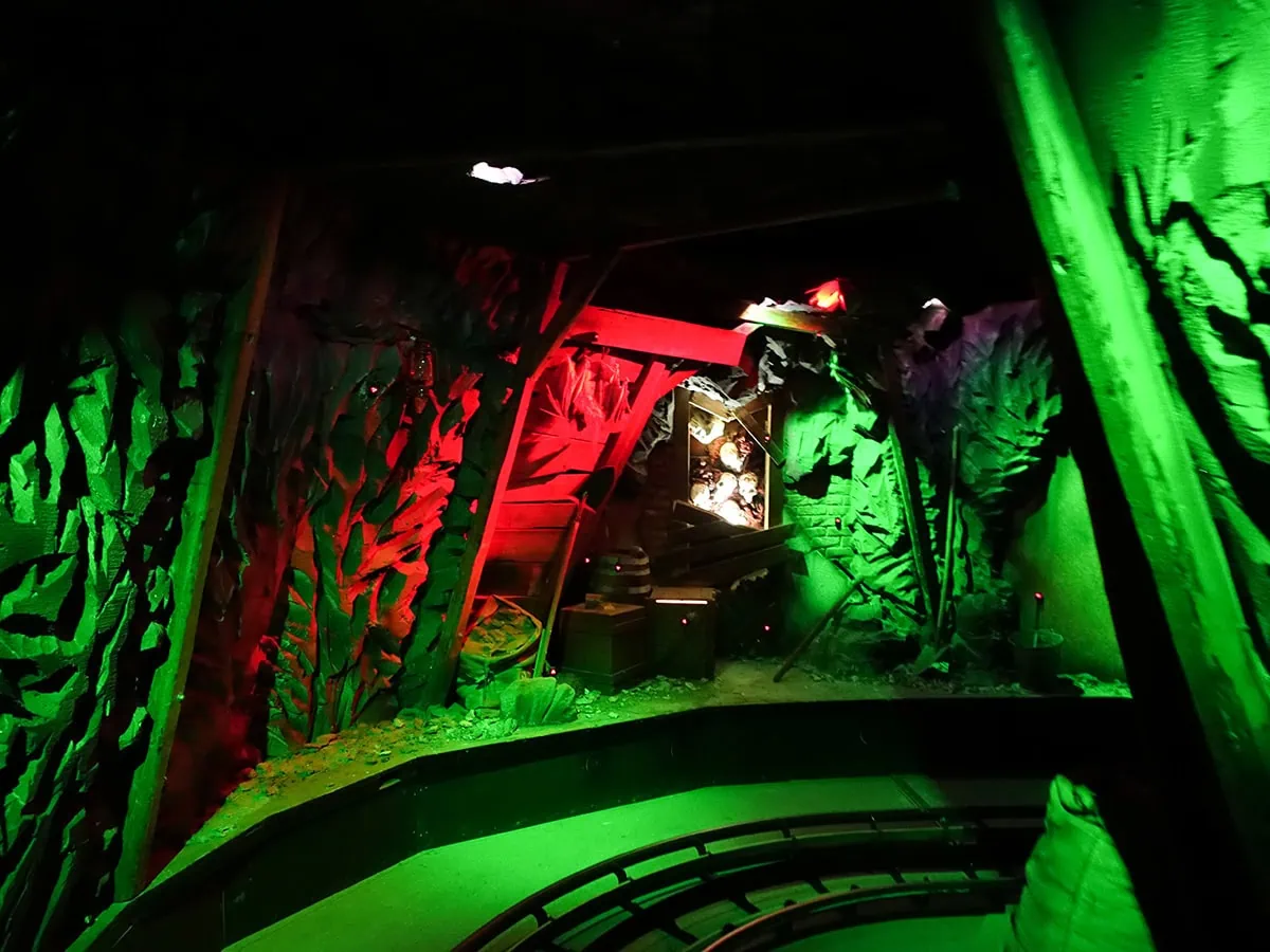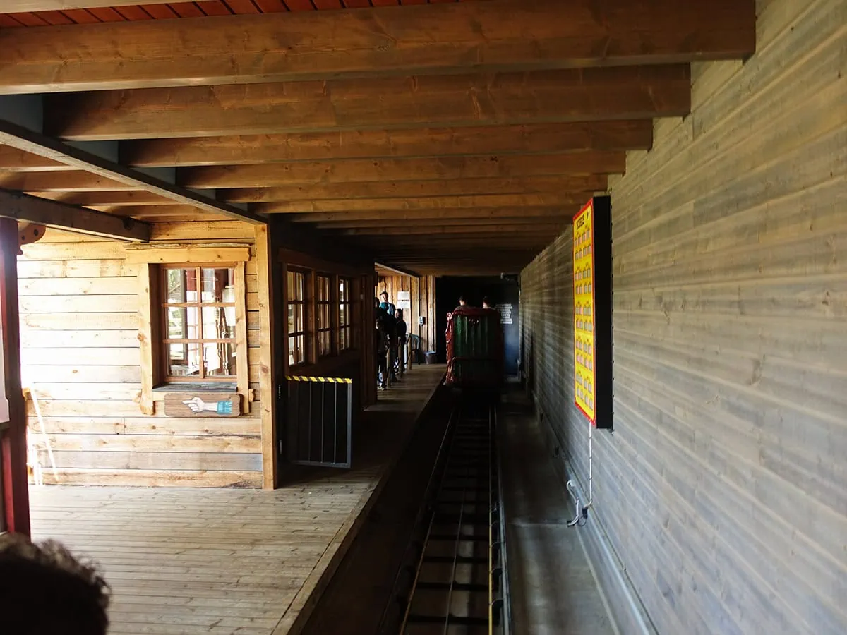 This interactive dark ride takes riders from a western-style hotel to a gold mine.