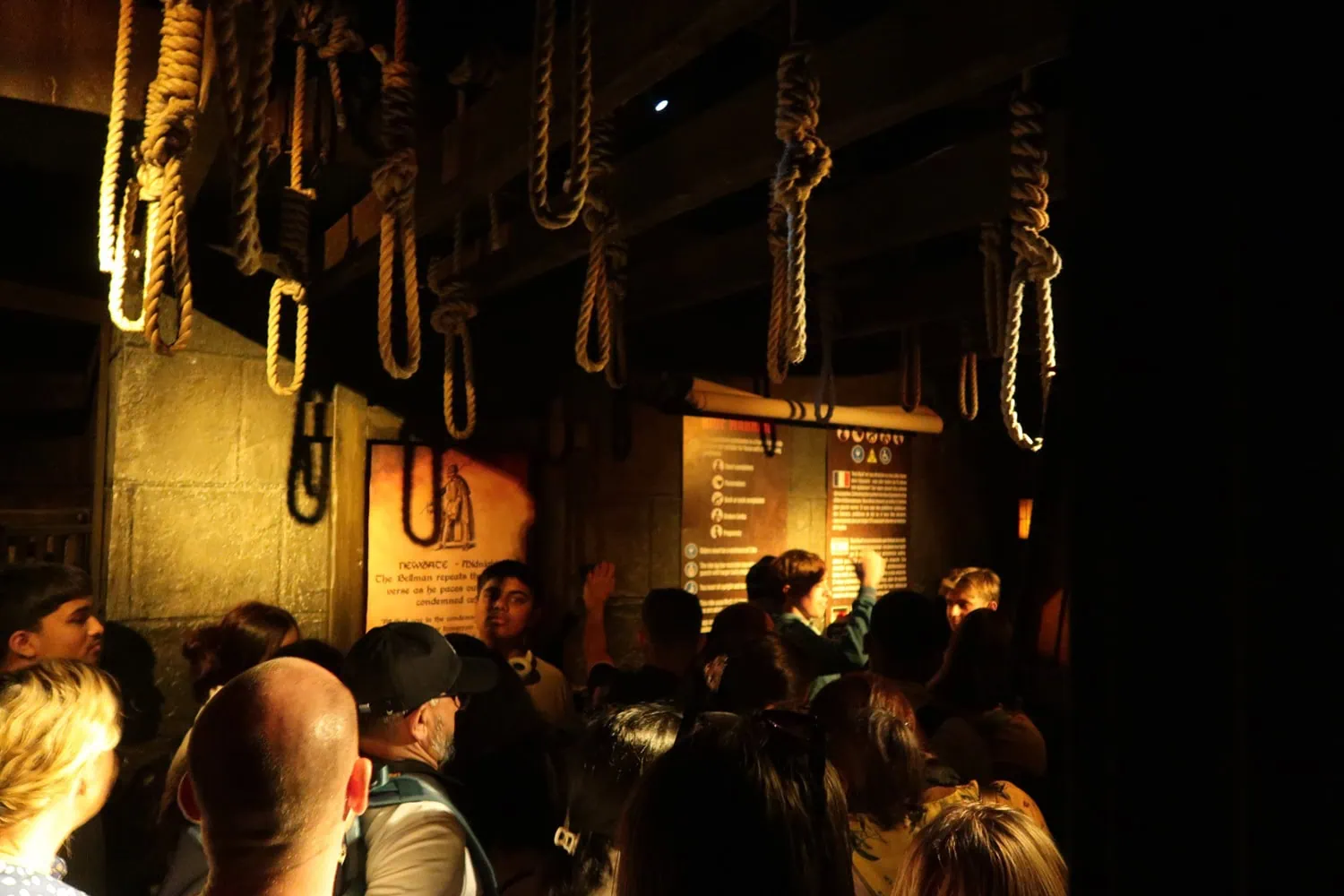 As one of several experiences in a linear sequence at the London Dungeons, Drop Dead: Drop Ride features two small back-to-back free fall towers. All guests have been sentenced to death at the gallows, they will hang for their crimes!