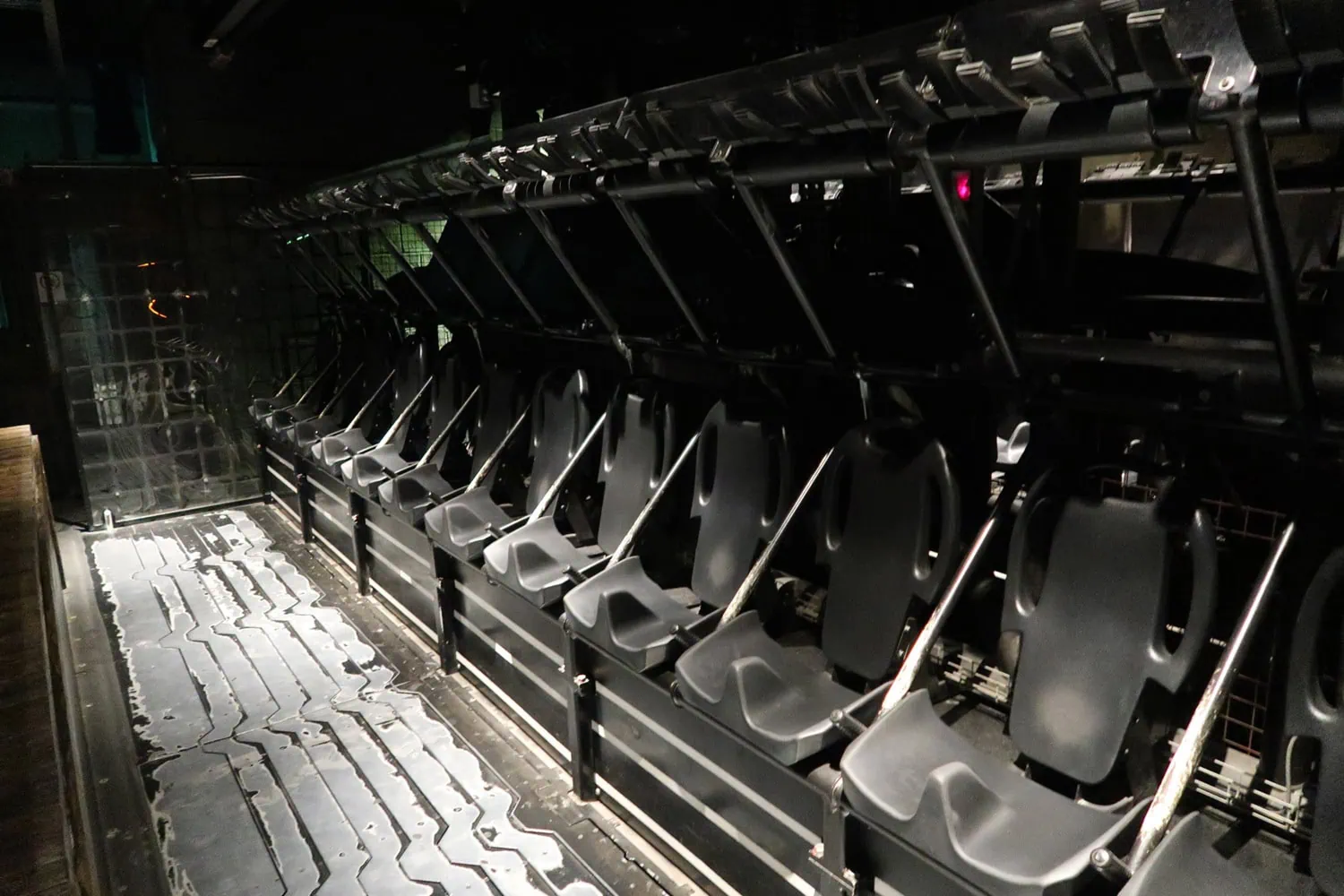 While Drop Dead has guests board the drop tower in the uppermost position and the ride sequence begins with the drop, Extremis boarded at ground level and the ride sequence ended with the drop.