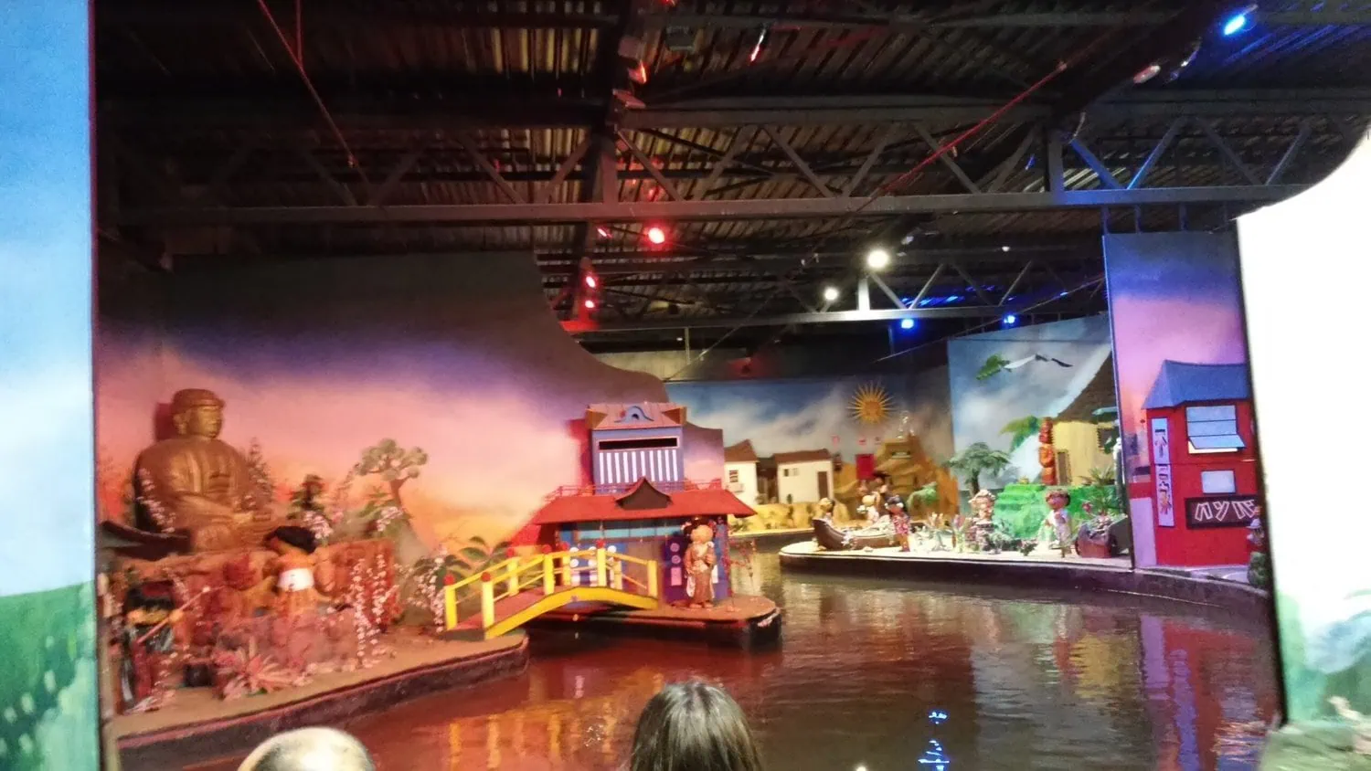 Fantasía was an It's a Small World-type dark ride that took guests on a trip around the world in boats. It was a tow boat system and is believed to have been created in-house. The station featured a space theme and was originally UV lit. The scenes were, in order: