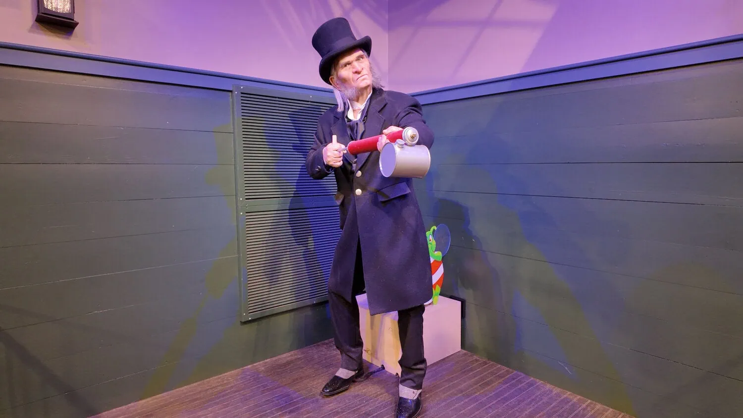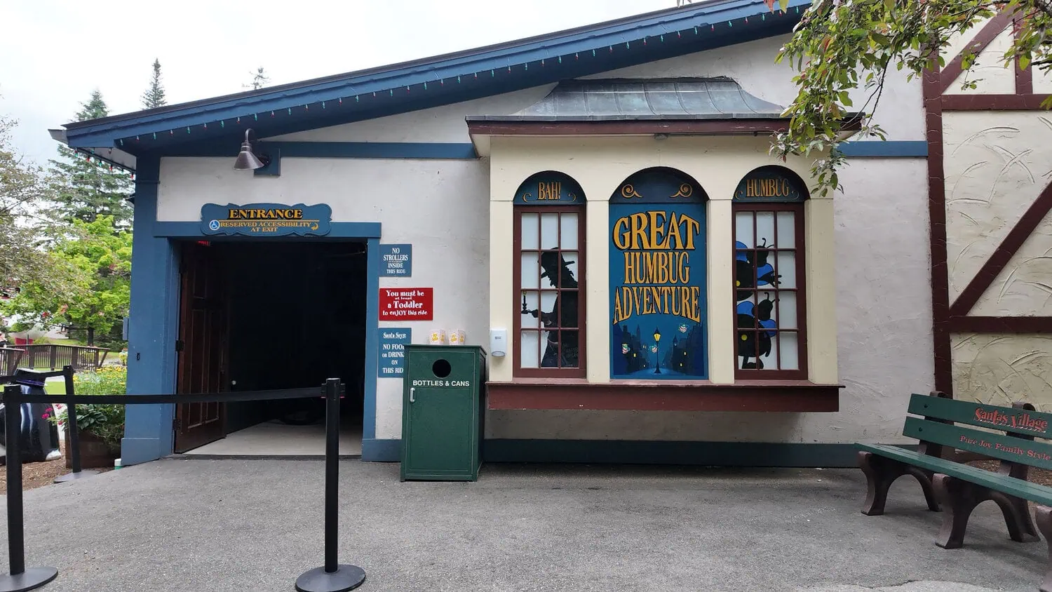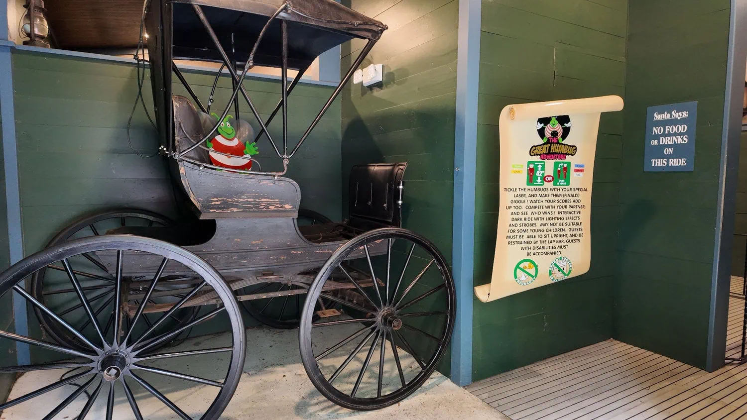 The story of the Great Humbug Ride is based on the book 'A Christmas Carol' by Charles Dickens. Riders are asked to enter the mansion of Ebenezer Scrooge and chase away the Humbugs by tickling them. Tickling causes the Humbugs to laugh and spread Christmas around the world. The ride contains 14 scenes with a total of 62 targets.