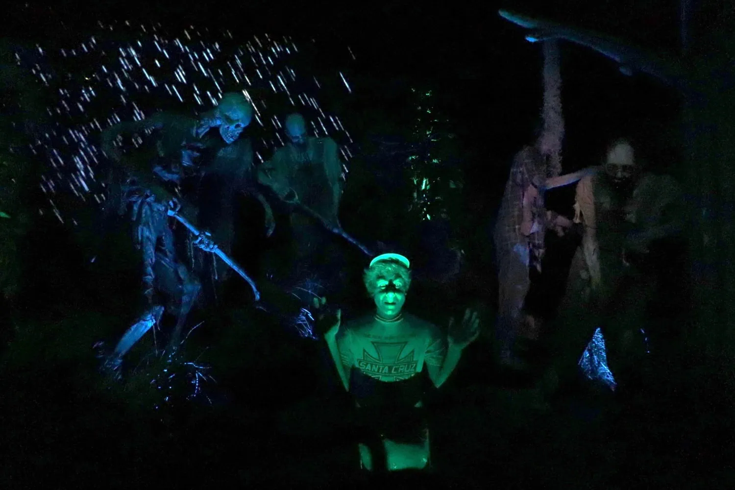 This ride offers a classic ghost train experience, though modern techniques are used for the ride system and animatronics. The ride was designed and built by R&R Creative Amusement Design, with the animatronics built by Sally Dark Rides. I.E. Park delivered a new ride system with rotating cars.