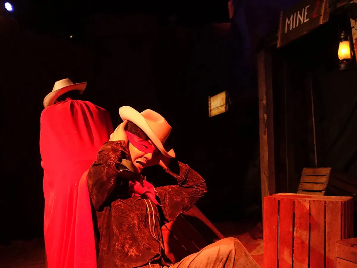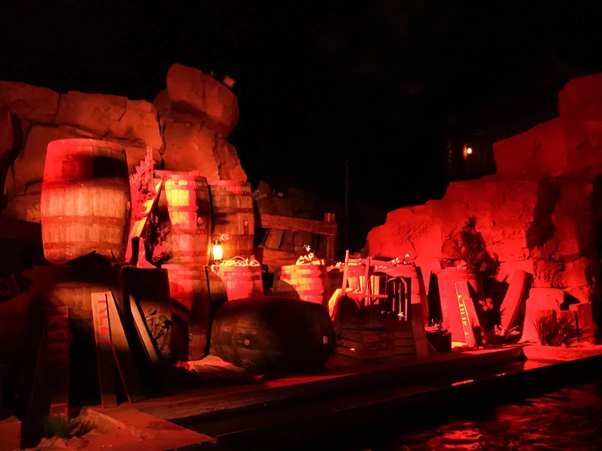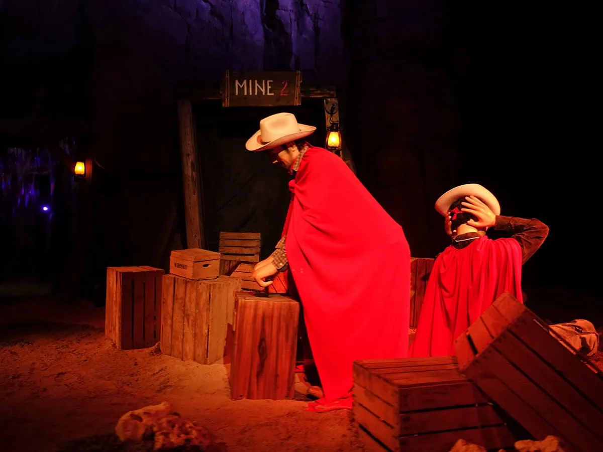 This is a retheme of the former Wild West Adventure dark ride. During the retheme, the ride system and all rockwork were kept in place, but the scenes were changed to follow the storyline of the Red Bandits. The entrance and exit were swapped around as well.