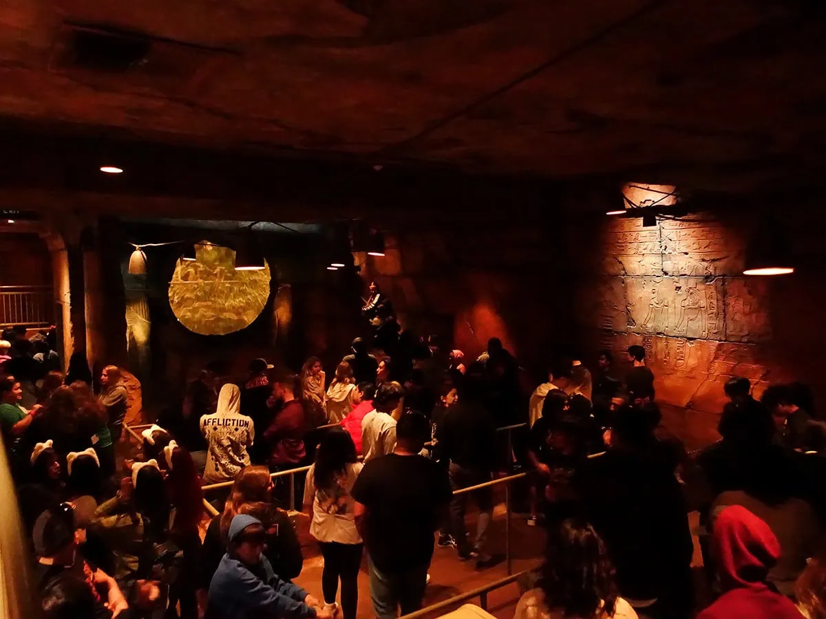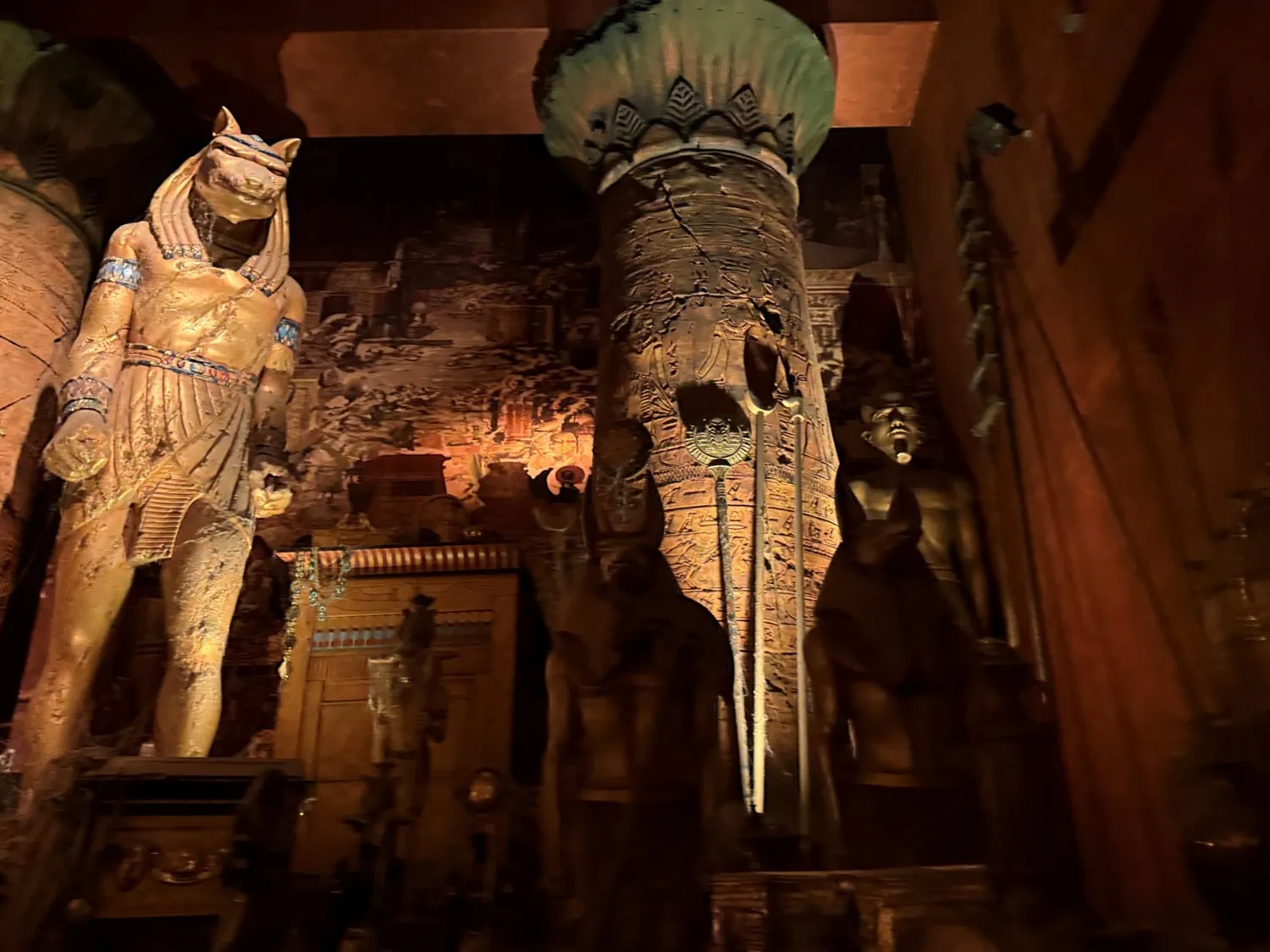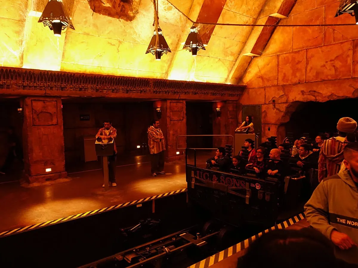 Revenge of the Mummy is a combination of a dark ride and a rollercoaster, built entirely indoors, based on the film The Mummy (1999). Riders are invited into the Museum of Antiquities where they join the film set of the fictional film 'Revenge of the Mummy'. They board the ride vehicles which start of in a dark ride section, where it becomes clear that the fictional curse from the film is actually real. Powered by the curse, the coaster train is launched into the roller coaster part of the ride.