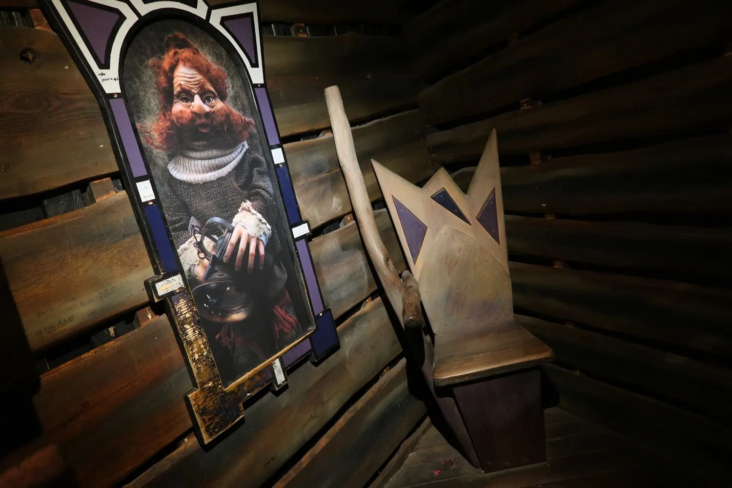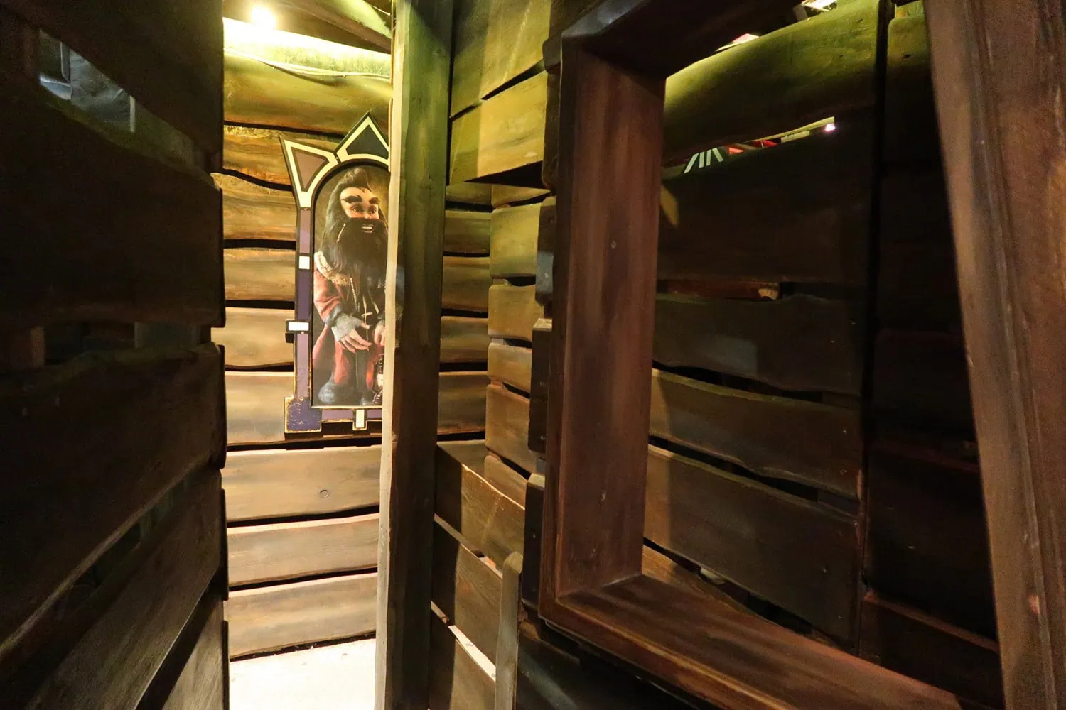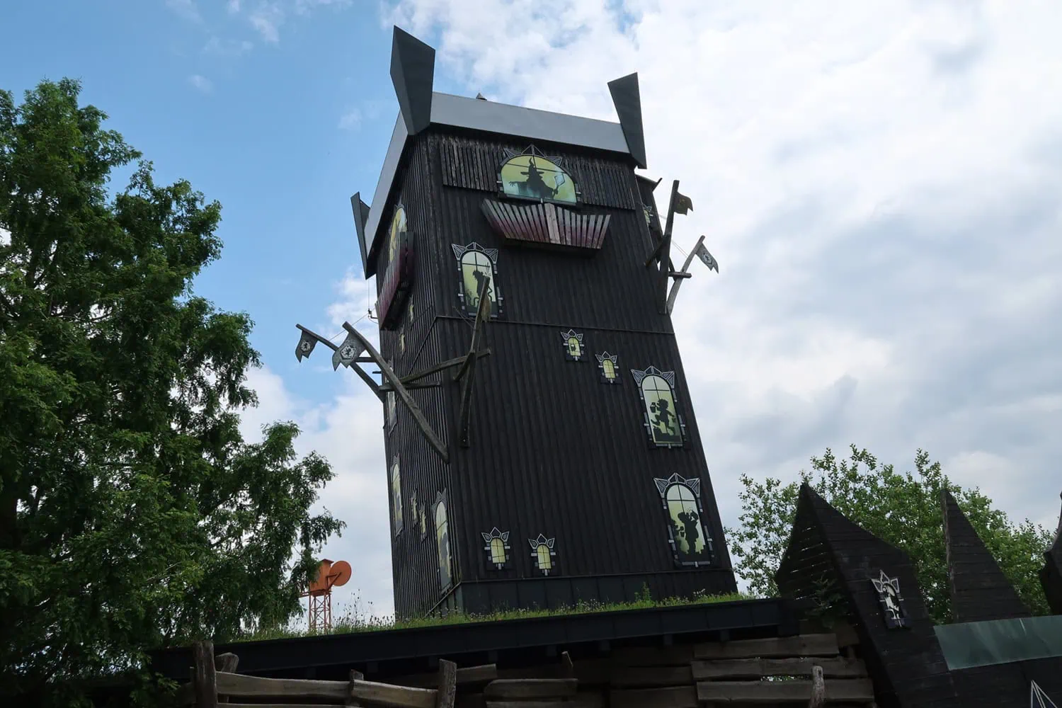 Thaolon is an indoor family freefall-tower by Zierer. The exterior depicts a large black tower with windows. In the windows, silhouettes of some sort of trolls or gnomes can be seen. The queue is like a maze of wooden pathways and feature portraits of the characters.