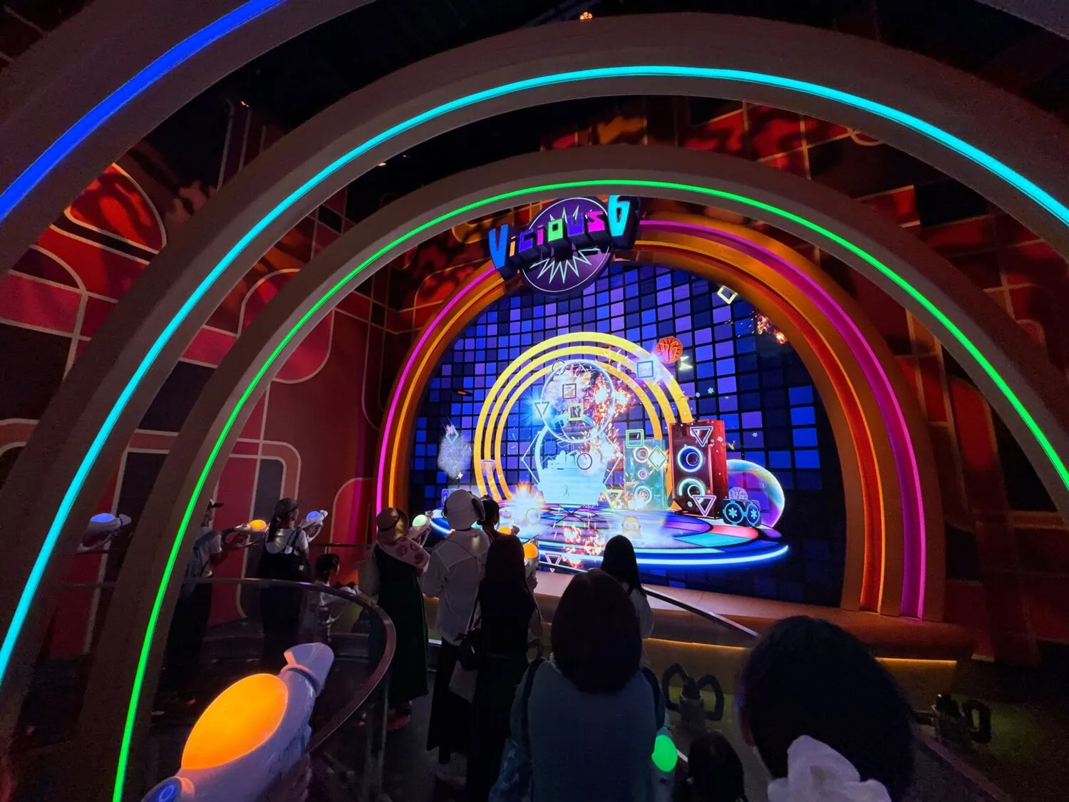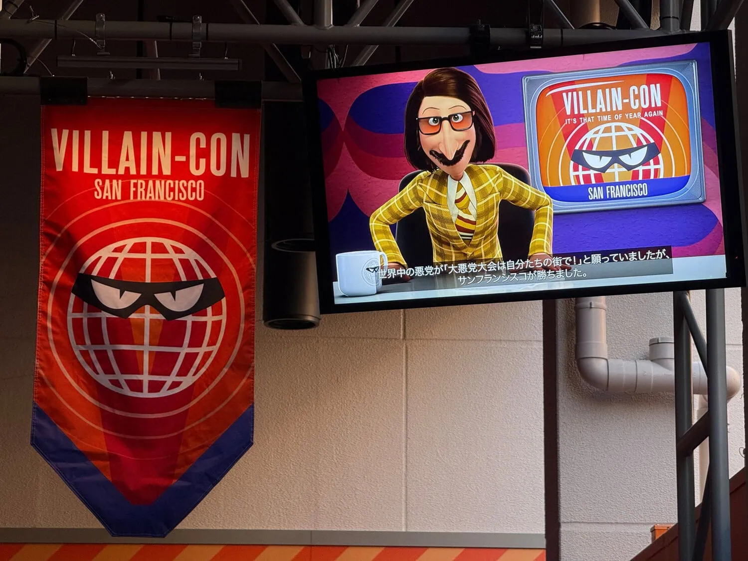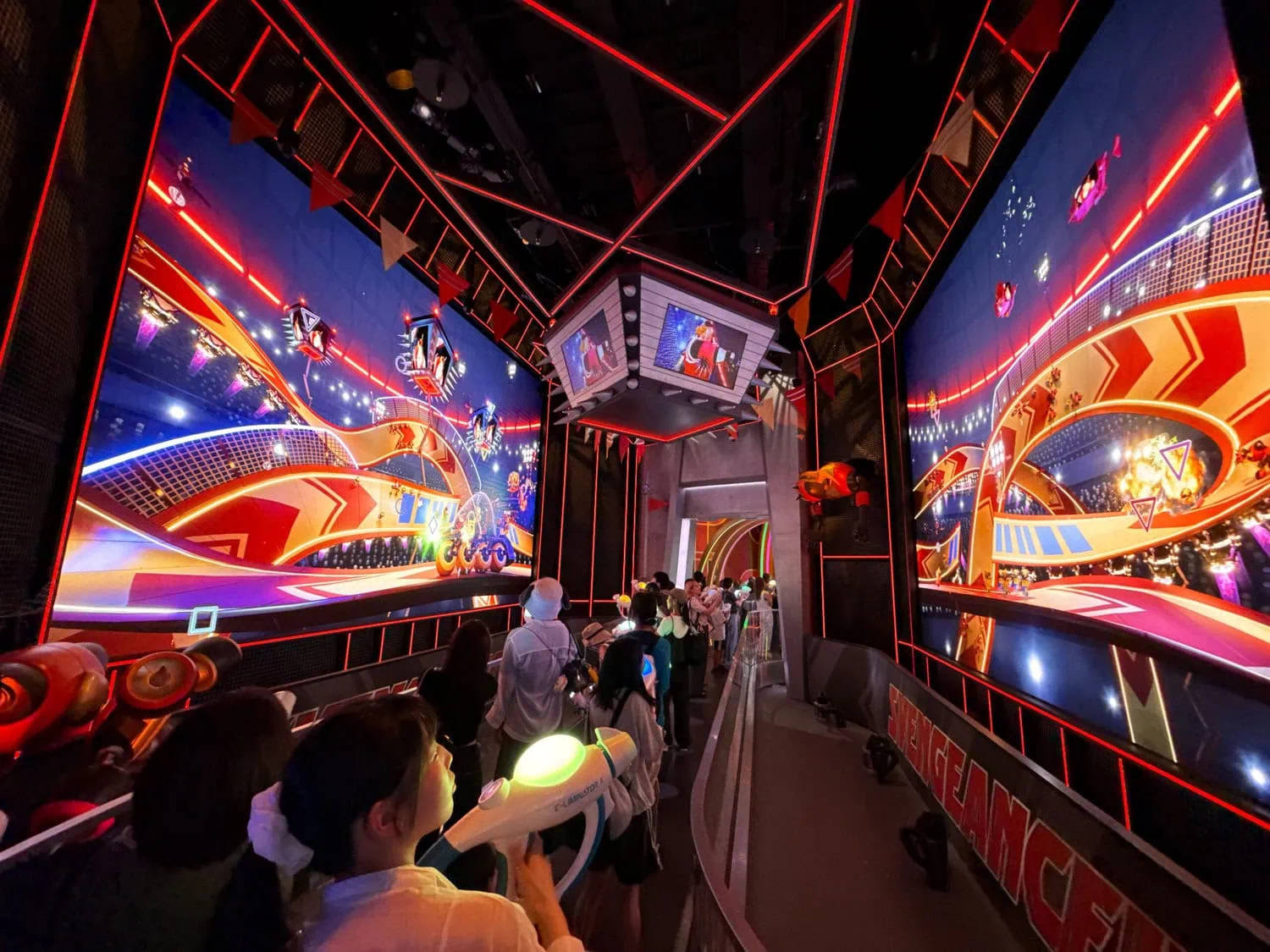 Villain-Con Minion Blast is a stand-up interactive dark ride. It uses an conveyor belt system to transport guests through a fictional Villain-Con. During the ride the well known minions wreck chaos all around.
