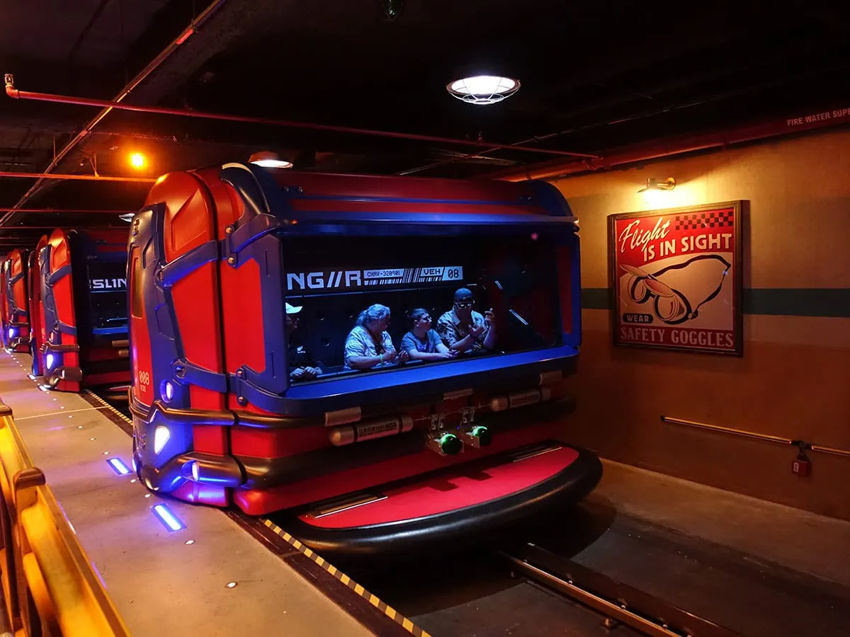 The WEB Slinger-vehicles are large cabins with two rows of four passengers sitting back-to-back, one row facing forward and one row facing backward. Interactive screens are located on each side of the track. The cars can rotate and make all passengers face one of the screens. Two vehicles depart in each ride cycle.